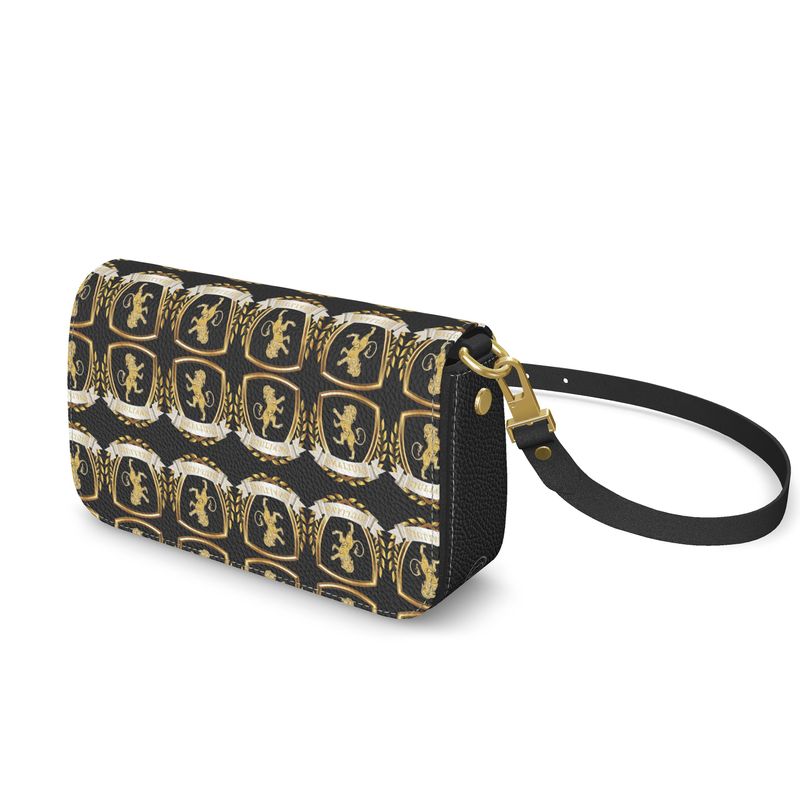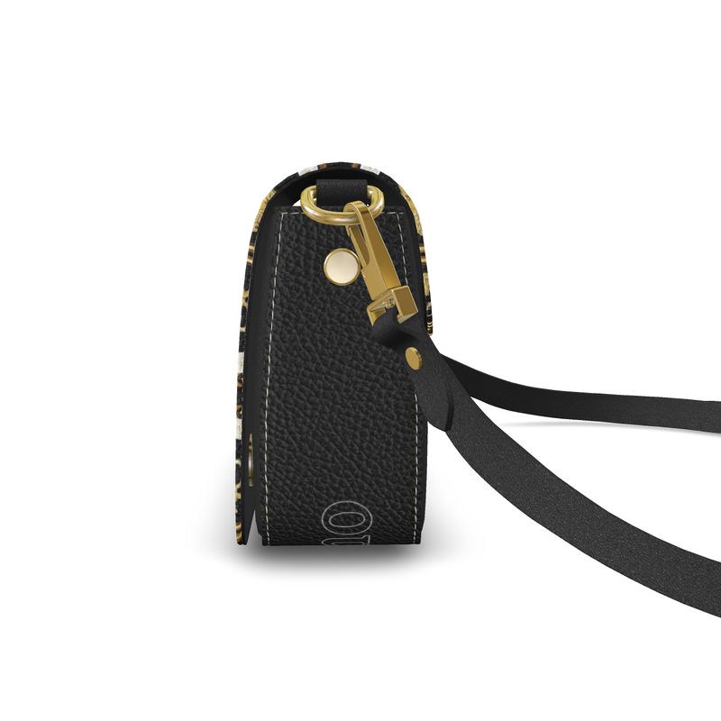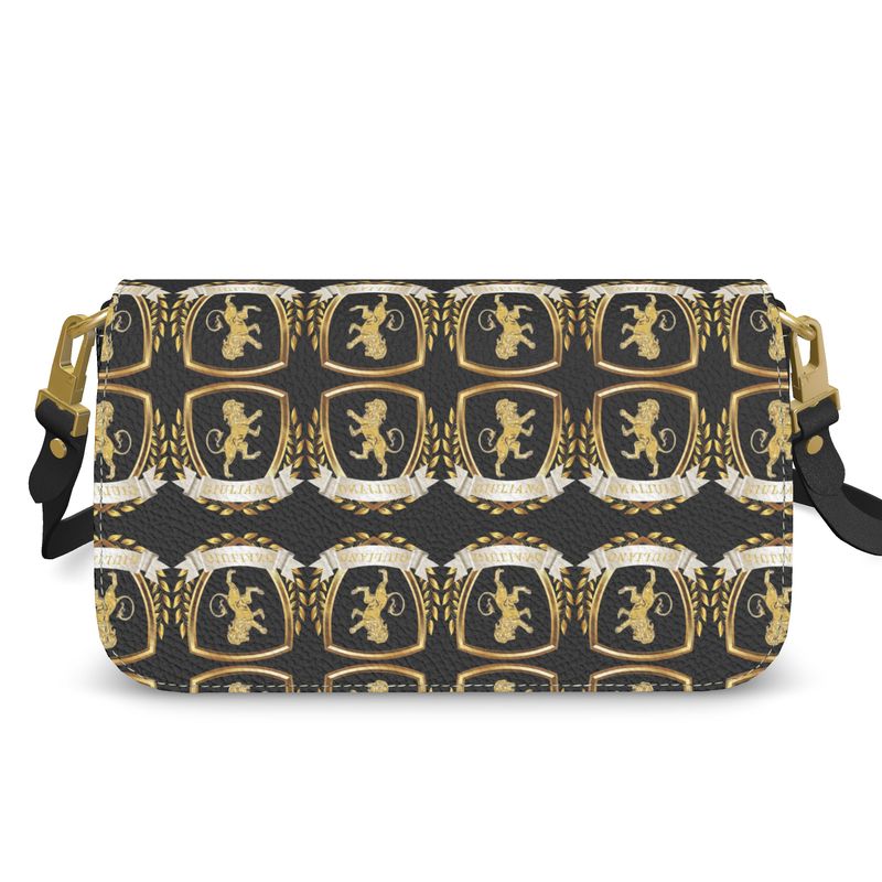 Black Nappa leather crossbody bag with the Giuliano Emblem in a patterned mirror formation and matching hardware. Black Suede inner lining. Foldover design kept sealed magnetically. Made by hand. Walk the town in style & luxury while keeping your personal items secure with this handbag.