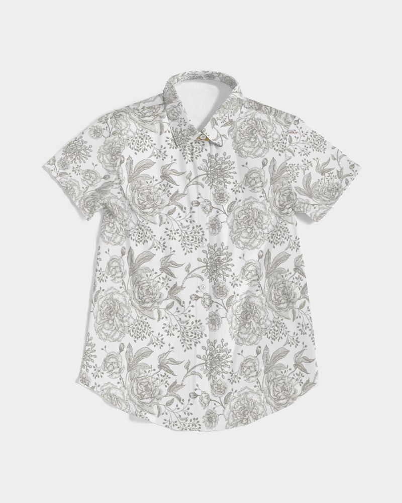 Keep it cute and classic in our Short Sleeve Button-Up Top, featuring lightweight woven fabric, a relaxed bodice, white buttons, and a curved hem. Pair with jeans and a blazer for a casual-chic workday look!